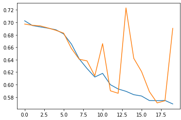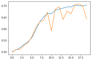 625/625 [==============================] - 13s 21ms/step - loss: 0.6882 - accuracy: 0.5424 - val_loss: 0.6873 - val_accuracy: 0.5390