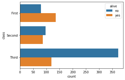 sns.countplot(data = df, y = 'class', hue = 'alive') # y축 class, alive별 색 표현