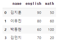 df = pd.DataFrame({'name' : ['김지훈', '이유진', '박동현', '김민지'],
