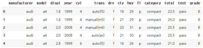 mpg['grade'] = np.where(mpg['total'] >= 30, 'A',