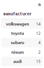 mpg.query('category == "compact"').groupby('manufacturer').agg(n = ('manufacturer', 'count')).sort_values('manufacturer', ascending = False)
