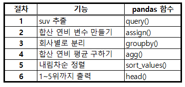 제조 회사별로 'suv' 자동차의 도시 및 고속도로 합산 연비 평균을 구해 내림차순으로 정렬하고, 1~5위까지 출력하기