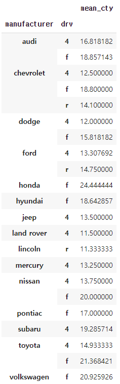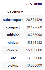 mpg.groupby('category').agg(cty_mean = ('cty', 'mean')).sort_values('cty_mean', ascending = False)