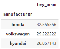 mpg.groupby('manufacturer').agg(hwy_mean = ('hwy', 'mean')).sort_values('hwy_mean', ascending = False).head(3)