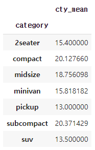 mpg.groupby('category').agg(cty_mean = ('cty', 'mean'))