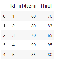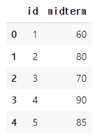 'midterm' : [60, 80, 70, 90, 85]})