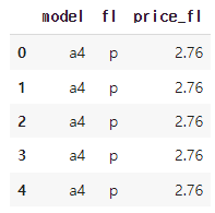 Q2 연료 가격 변수가 잘 추가됐는지 확인하기 위해 model, fl, price_fl 변수를 추출해 앞부분 5행을 출력해 보세요.