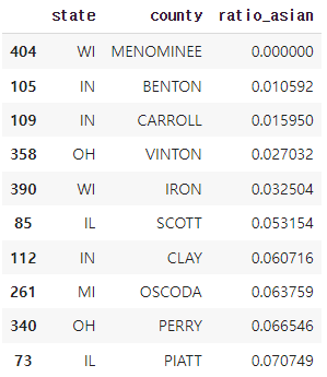 midwest.assign(ratio_asian = midwest['popasian'] / midwest['poptotal'] * 100).sort_values('ratio_asian').head(10)[['state', 'county', 'ratio_asian']]