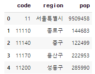 # df_pop 행정 구역 코드, 인구