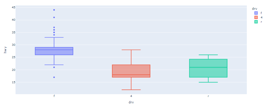 px.box(data_frame = mpg, x = 'drv', y = 'hwy', color = 'drv')