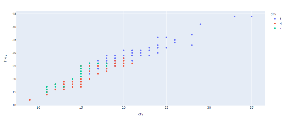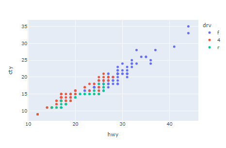 px.scatter(data_frame = mpg, x = 'cty', y = 'hwy', color = 'drv')