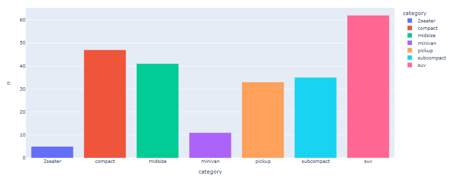 px.bar(data_frame = df, x = 'category', y = 'n', color = 'category')