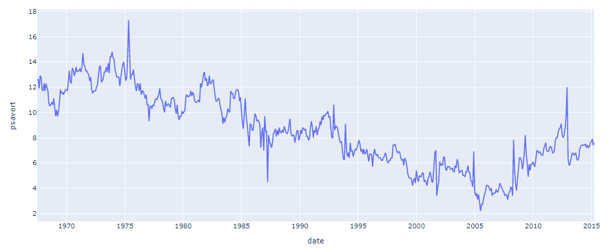 px.line(data_frame = economics, x = 'date', y = 'psavert')