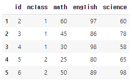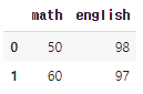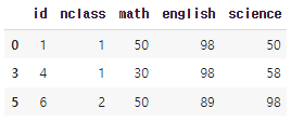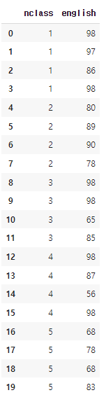 df.loc[df['nclass'] == 1, ['math', 'english']] # 조건을 충족하는 행에서 여러 열 추출