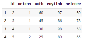 df.iloc[1:5] # 연속된 행 추출: x행 이상 y행 미만