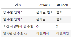 - df.iloc[x:y] = x행 이상 y행 미만 추출