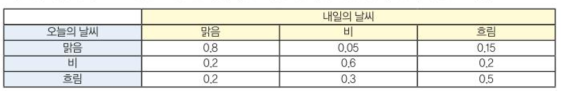 - 내일 날씨는 오늘 날씨에만 종속: 마르코프 과정