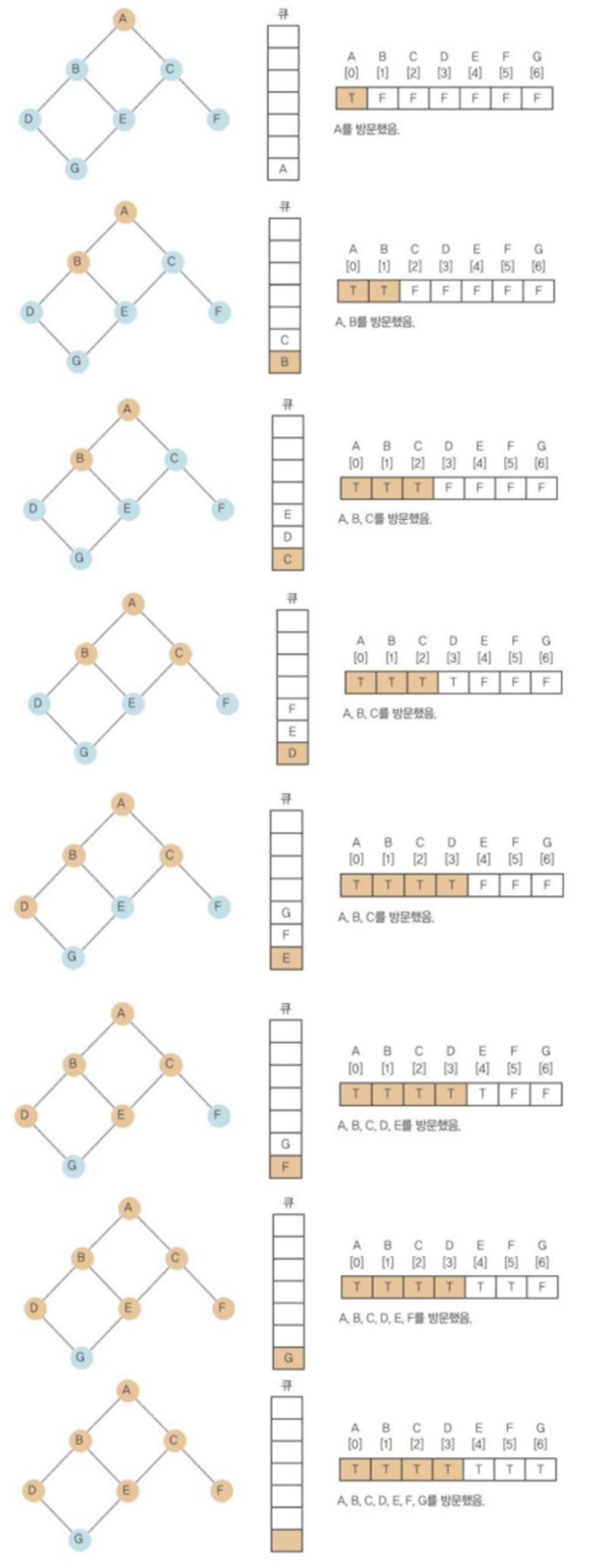 - 6단계: E에 1차로 연결된 곳에 방문하지 않은 곳이 없으므로 큐에서 F를 선택해 탐색을 수행