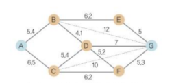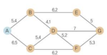 - 6단계: 저장소 D에서 저장소 S에 있는 A, B, C, D, E를 제외한 F, G 중에서 값이 가장 작은 F를 저장소 S로 이동한다. 저장소 T의 G노드에 연결된 D, E, F 노드 중 거리가 짧은 것을 채택한다. 저장소 D에서 마지막 남은 G를 저장소 S로 이동한다.