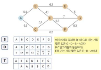 - 준비 단계: 시작점에서 다른 노드까지 가는 최단 경로를 다익스트라 알고리즘으로 찾음, 알고리즘을 수행하기 위해 S(처리가 완료된 노드의 집합), D(A~G번 노드에 대해 시작 노드로부터 소요되는 비용을 저장하는 곳), T(해당 노드로 가는 데 연결된 노드의 번호) 저장소 준비