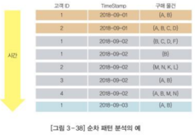 - 차이점: 순차 패턴 분석은 시간, 순서에 따른 사건의 규칙을 찾는 것이므로 분석하고자 하는 데이터에 식별정보, 시간 변수가 필요, 연관규칙 분석은 동시에 발생한 사건 또는 시간을 고려하지 않은 사건에 대한 연관 관계를 분석하는 것