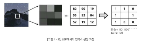 - 각 픽셀의 주변 3x3 영역의 상대적인 밝기 변화를 이진수로 코딩한 인덱스 값
