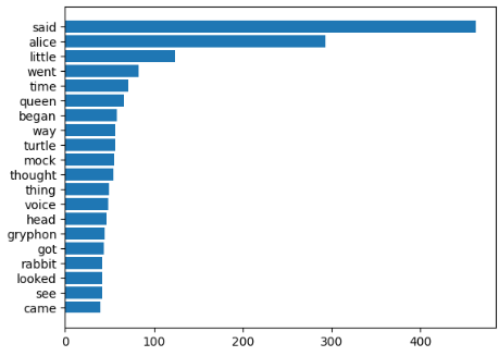 'said': 462, 'alice': 385, 'little': 128, 'one': 98, 'know': 88, 'like': 85, 'went': 83, 'would': 78, 'could': 77, 'thought': 74, 'time': 71, 'queen': 68, 'see': 67, 'king': 61, 'began': 58, 'turtle': 57, "'and": 56, 'way': 56, 'mock': 56, 'quite': 55,