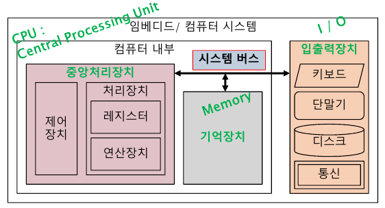 컴퓨터 구조는 컴퓨터를 구성하고 있는 구성 요소의 동작 요소와 특징을 고려해 컴퓨터가 어떤 방식으로 명령을 받아 연산을 수행하며, 데이터를 표현하는지에 대한 전반적인 것을 의미합니다. 이를 이루고 있는 하드웨어는 크게 '중앙 처리 장치', '기억 장치', '입출력 장치', '시스템 버스'로 나눌 수 있습니다. 오늘은 그중 '중앙 처리 장치(CPU)'와 '기억장치(Memory)'에 대해 알아보겠습니다.