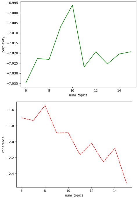 print(f'num_topics: {i}, perplexity: {pv:0.3f}, coherence: {cv:0.3f}')