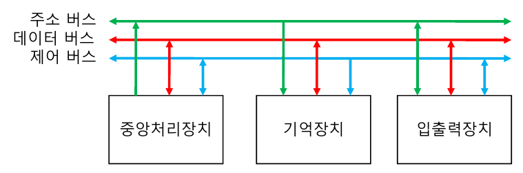 시스템 버스(System Bus)는 컴퓨터의 구성요소를 서로 연결하고 데이터를 전달하기 위한 경로를 의미합니다. 시스템 버스는 주소 버스 (Address Bus), 데이터 버스 (Data Bus), 제어 버스 (Control Bus)로 구분됩니다. 우선 주소 버스는 기억 장치나 입출력 장치의 주소를 지정 즉, 포트 번호를 전달하는 것으로, 기억 장치의 용량에 따라 달라집니다. 데이터 버스는 데이터를 전달하는 경로로, 일반적으로 8의 배수로 구성됩니다. 데이터 버스의 비트 수는 레지스터의 크기와 같고 이는 단어 크기(word size)와 같습니다. 마지막으로 제어 버스는 주소 버스와 데이터 버스를 제외한 나머지 신호로 제어 신호(Read, Write)를 전달하며, 각각 고유한 기능을 가집니다.