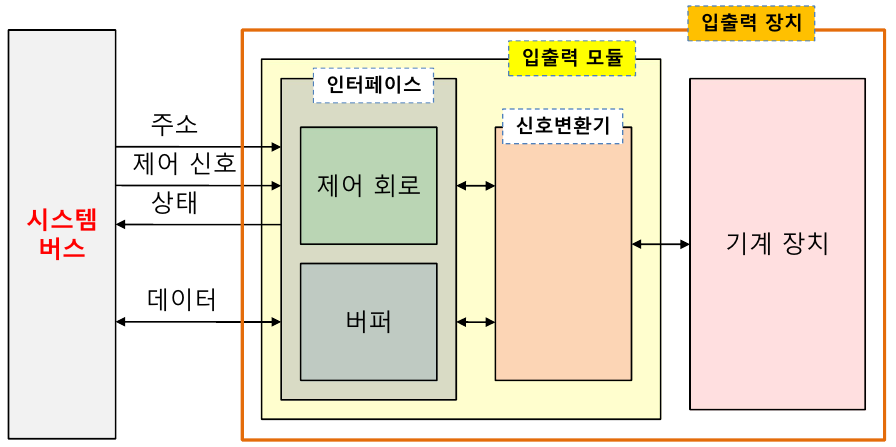입출력 장치의 구조는 위의 그림과 같습니다. 이 중 신호 변환기는 제어신호와 데이터를 기계 동작으로 변환하는 기능을 수행하고, 제어회로는 CPU의 신호를 해석하여, I/O 기기의 상태정보를 공급하며, 버프는 속도 차이로 인해 데이터를 임시로 보관하고, 속도를 완충시키는 역할을 수행합니다.