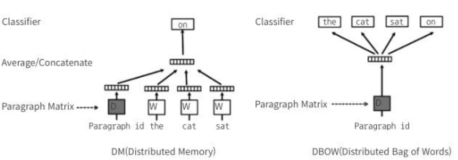 - DM(Distributed Memory): Word2Vec의 CBOW에 문서 ID를 추가한 형태