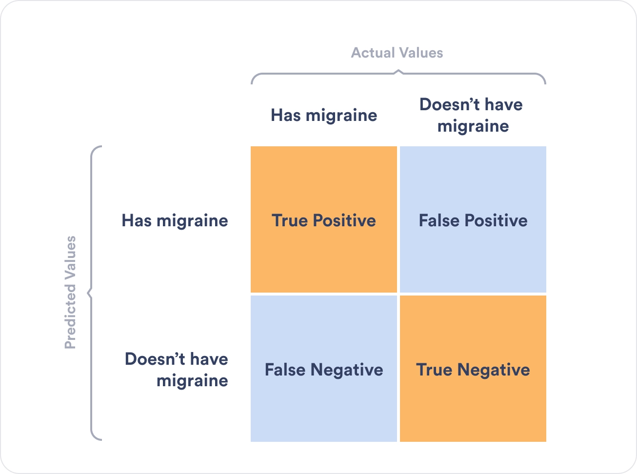혼동 행렬과 그 값을 더 잘 이해하기 위해 다음 예제를 고려해 보겠습니다. 편두통으로 고통 받는 환자의 수를 예측할 수 있는 모형을 만들고 싶다고 가정해보겠습니다.