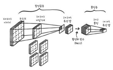 합성곱층을 통해 만들어진 특성 맵에 활성화 함수로 렐루 함수를 적용하고 풀링 적용
