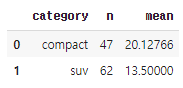 - p-value가 0.05 보다 작기 때문에 이 분석 결과는 'compact'와 'suv'간 평균 도시 연비 차이가 통계적으로 유의하다