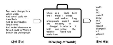 - 텍스트는 정의한 특성에 대한 특성 값의 집합으로 변환